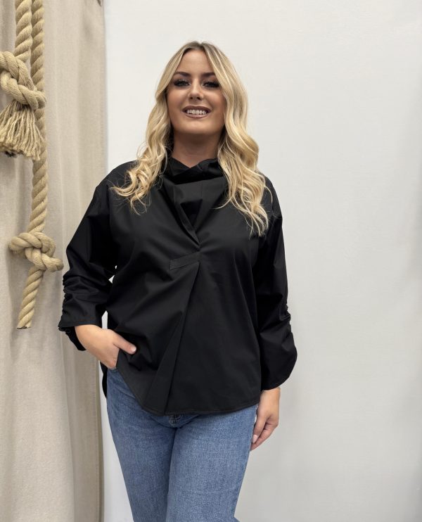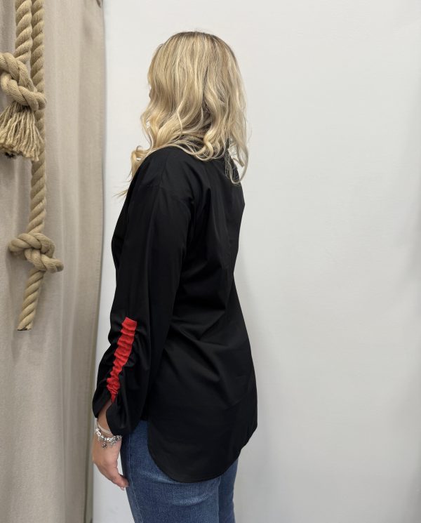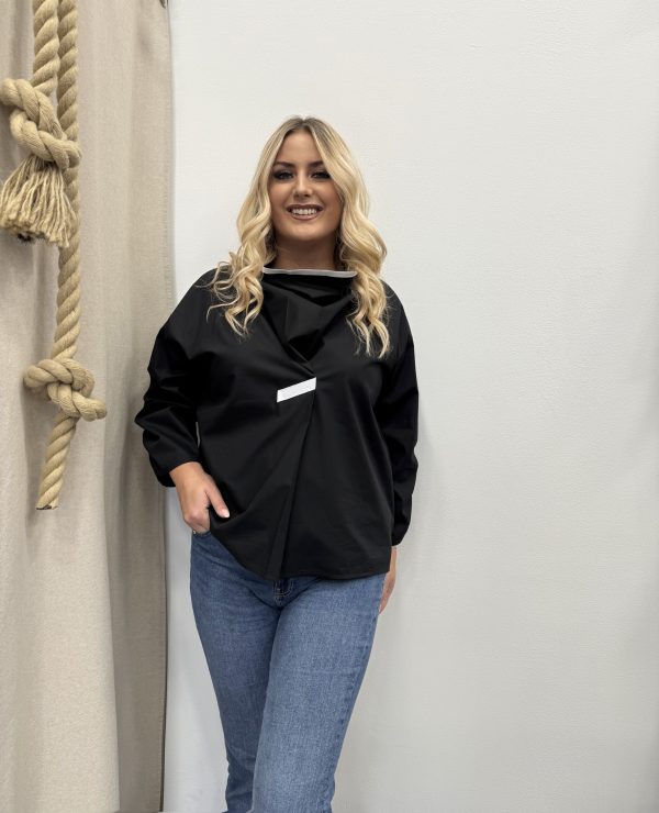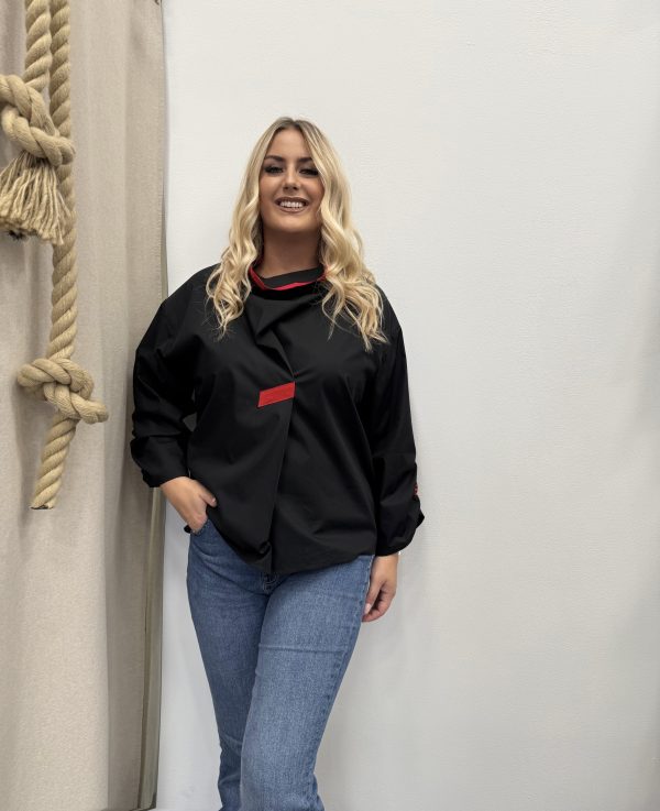 Košulja Aurora s većom kragnom koja nudi odvažan izgled. Kratka je sprijeda dok je straga nešto duža. Ukrašena je detaljima na kragni, prednjici i rukavu u boji. Lako se kombinira s različitim odjevnim komadima. Idealno pristaje uz hlače i uz naše prsluke.