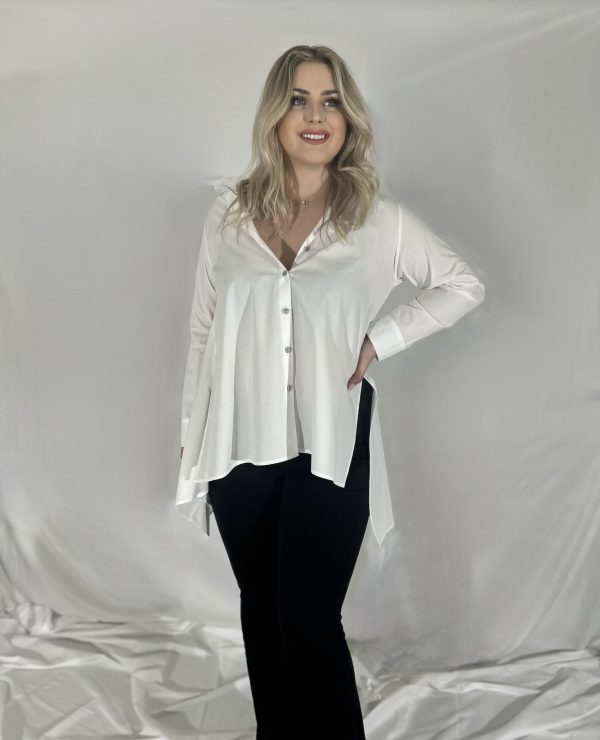 Ova košulja se izdvaja svojim jedinstvenim krojem koji kombinira duže i kraće stranice, stvarajući modernu i neobičnu siluetu. Kada se nosi, savršeno pristaje, pružajući udobnost i pokrivajući sve što treba. Izrađena od laganog i prozračnog pamuka, idealna je za tople dane jer omogućava koži da diše.